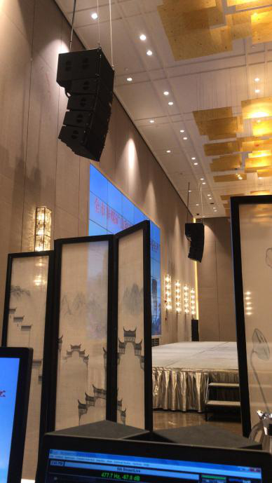 酒店牡丹廳為729平米,高8米無柱宴會廳,配置了雙十寸線陣列音箱,與演出級別專業(yè)功放、搭配英國品牌Studiomaster的Digileve系列前級處理系統(tǒng),組成一套完美音效、人聲表現(xiàn)突出的高端擴聲系統(tǒng)。工程達(dá)到極高標(biāo)準(zhǔn),為酒店搭建起一套設(shè)備先進(jìn)、性能穩(wěn)定可靠專業(yè)擴聲系統(tǒng),得到使用方的一致好評!